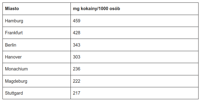Z badań jednoznacznie wynika, że od 2016 roku w Niemczech wzrosło spożycie kokainy. W 2021 r. w ściekach wykryto więcej narkotyków aż w 32 miastach porównując z rokiem poprzednim.